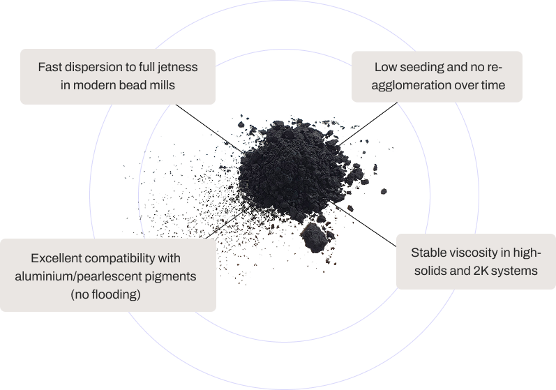 ultra-fine, gas-black–type series for high-jetness automotive topcoats and metallics.