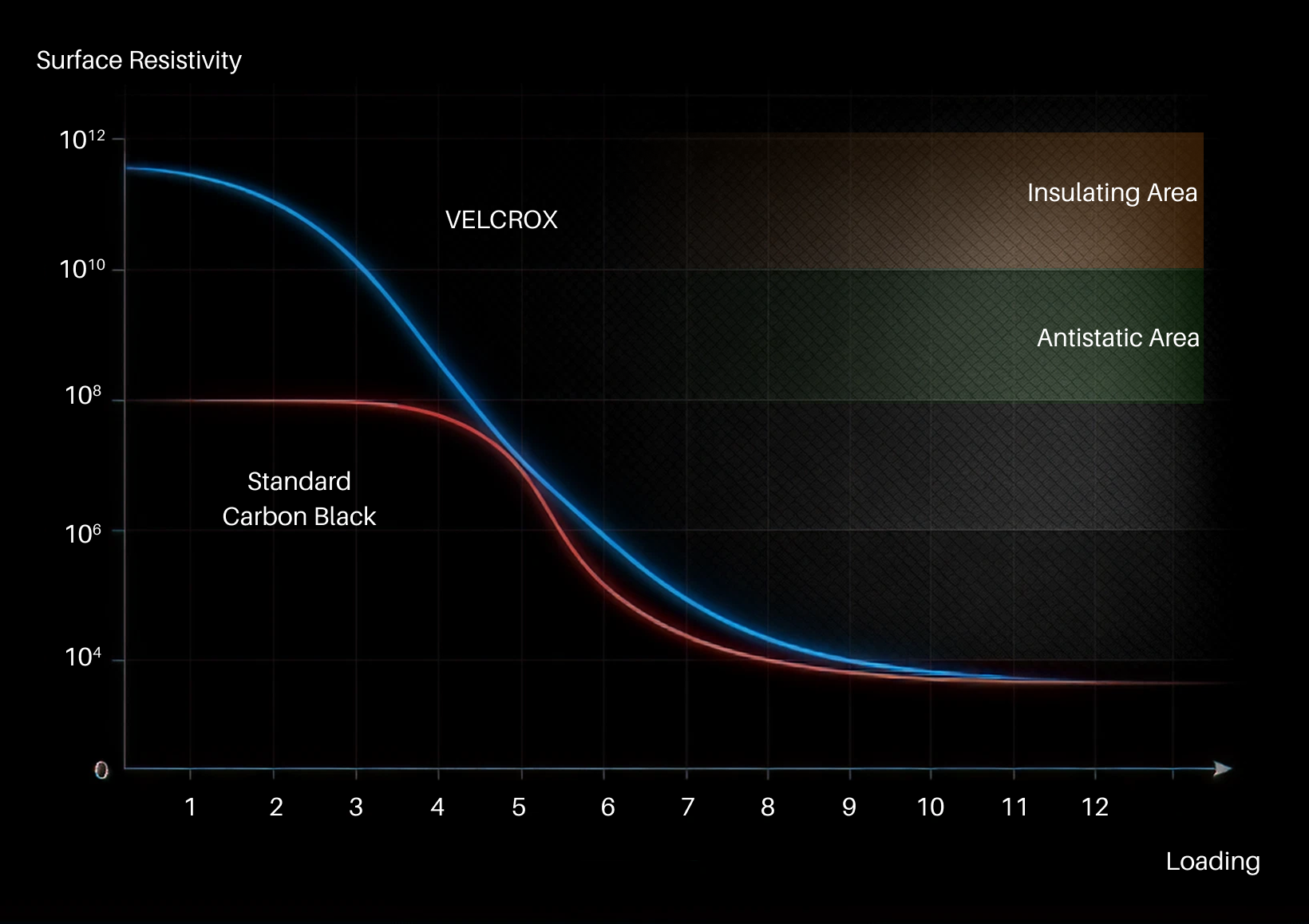 VELCROX shifts the percolation threshold to lower loading which enables antistatic or conductive fibre performance while preserving mechanical integrity of the fibre.