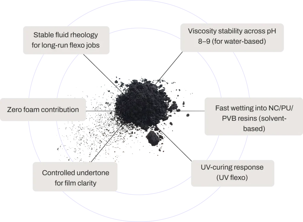 | NOBLEX® | A balanced-structure carbon black series optimized for rheology stability, gloss control and tint consistency in printing ink systems. It supports reliable flow and colour consistency during long production runs. | ||